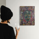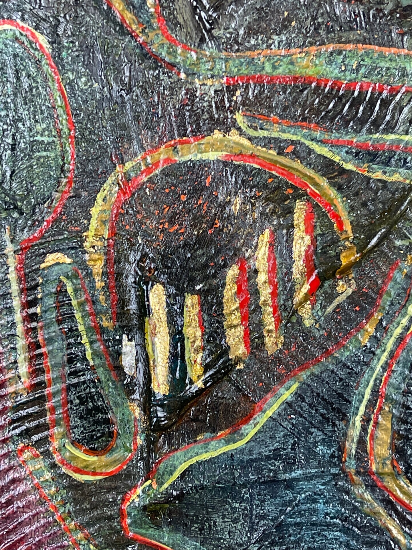 Mixed media: oils, acrylique and metal leaf (gold, silver, and copper)